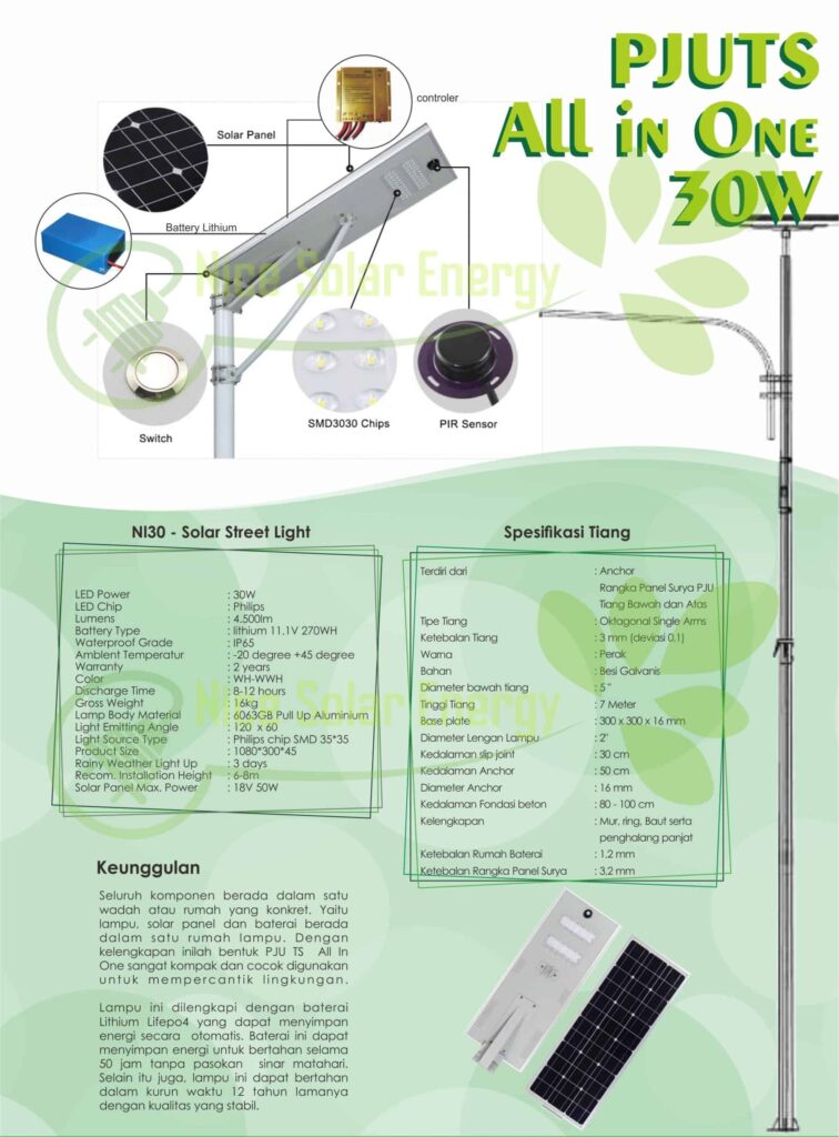 Lewati ke kontenSebelumnya Selanjutnya KEUNGGULAN– Hemat energi karena 100% dari sinar matahari– Lokasi bisa jauh dari jaringan PLN– Bebas perawatan– Cahaya LED super terang dan tahan lama– Hemat biaya– Lampu menyala secara otomatis– Otonomi lampu sampai 2 hari kondisi mendung– Bergaransi & layanan purna jual yang luas dan terjamin A P L I K A S I–