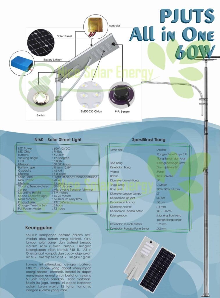 KEUNGGULAN– Hemat energi karena 100% dari sinar matahari– Lokasi bisa jauh dari jaringan PLN– Bebas perawatan– Cahaya LED super terang dan tahan lama– Hemat biaya– Lampu menyala secara otomatis– Otonomi lampu sampai 2 hari kondisi mendung– Bergaransi & layanan purna jual yang luas dan terjamin A P L I K A S I– Jalan area